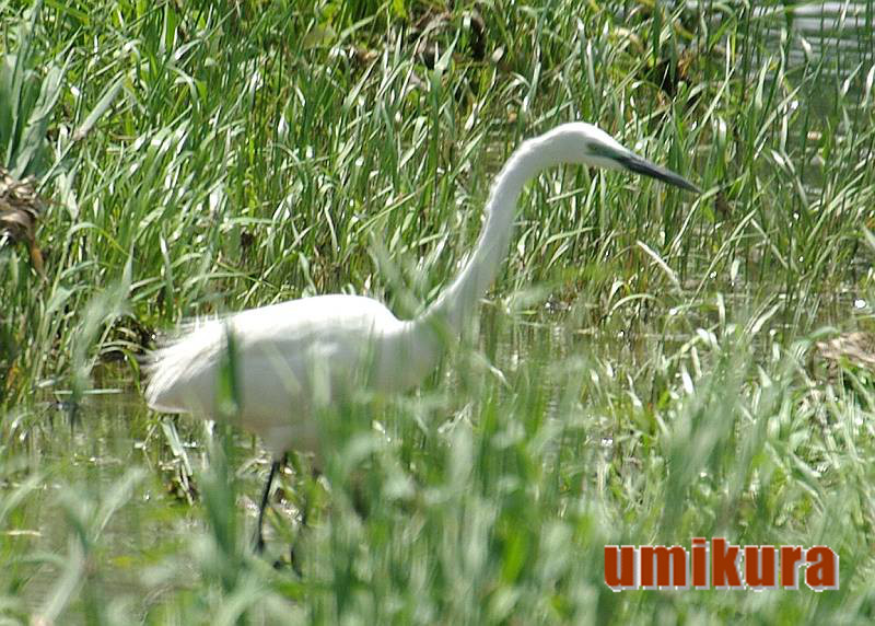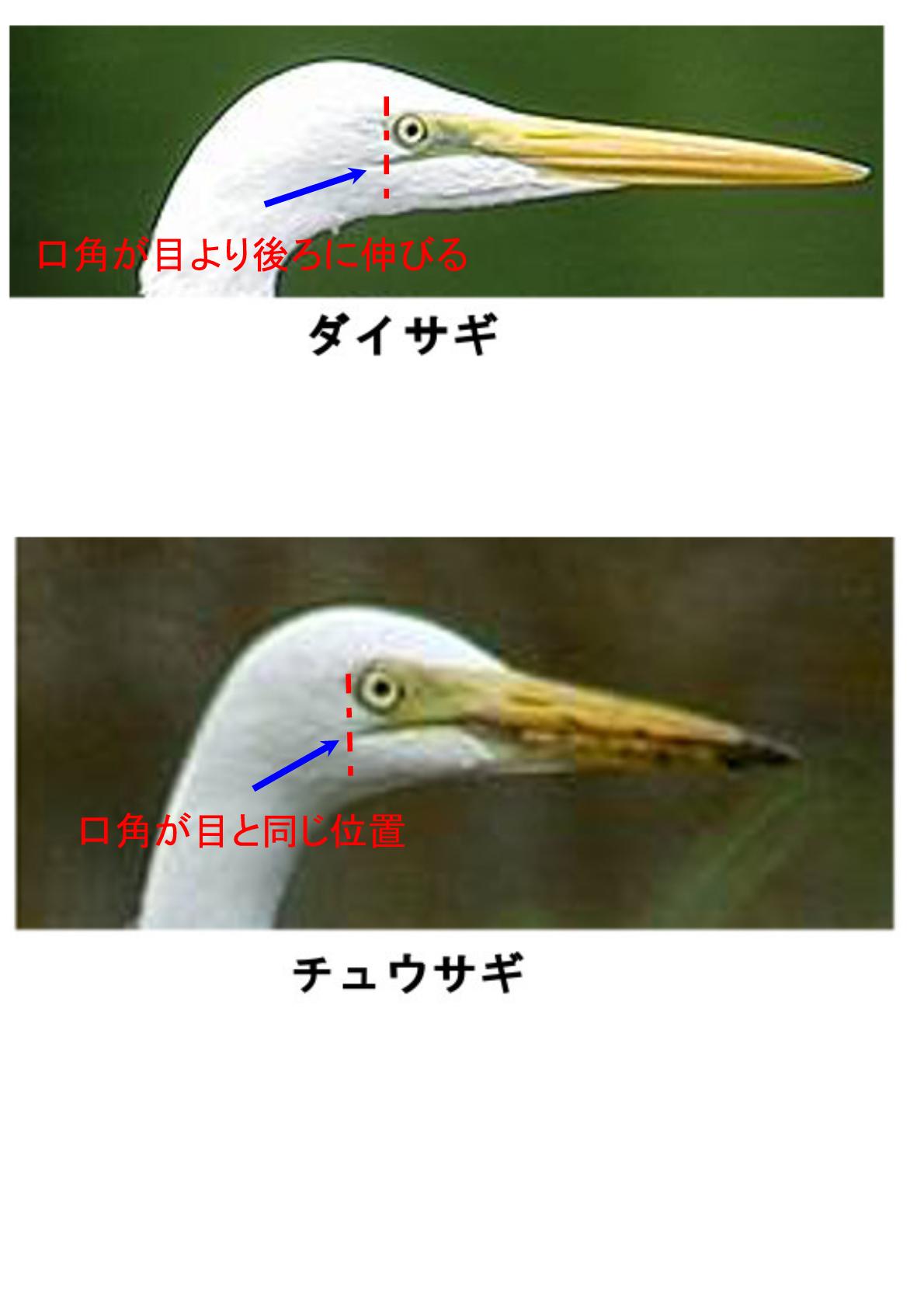 チュウサギと非常ににています。図鑑等ではダイサギの方が大きいとよく書かれていますが、単体でいると大きさの比較が出来ないので良く観察しないと判りません。 目元の口角が目より後ろに来ていることでチュウサギと識別できます。 アオサギに次ぐ大きさで飛んでいる姿は結構迫力があります。春から初夏の繁殖期にはクチバシが黒く目元もブルーになり、後ろに飾り羽が付き大変綺麗になります。