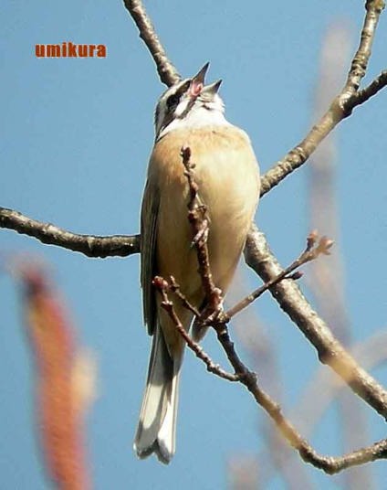 ホオジロは春にきれいな声でさえずっているのが川沿いのあちこちで聞こえます。 枝にとまって大きく口をあけて一生懸命歌っているみたいですね。冬の寒い日でも必ず姿を見せてくれます。 真正面からの顔はちょっと怖いかも・・・。