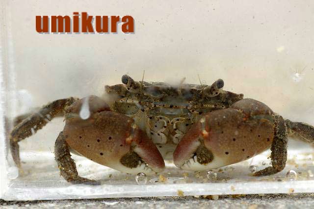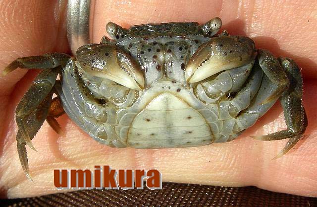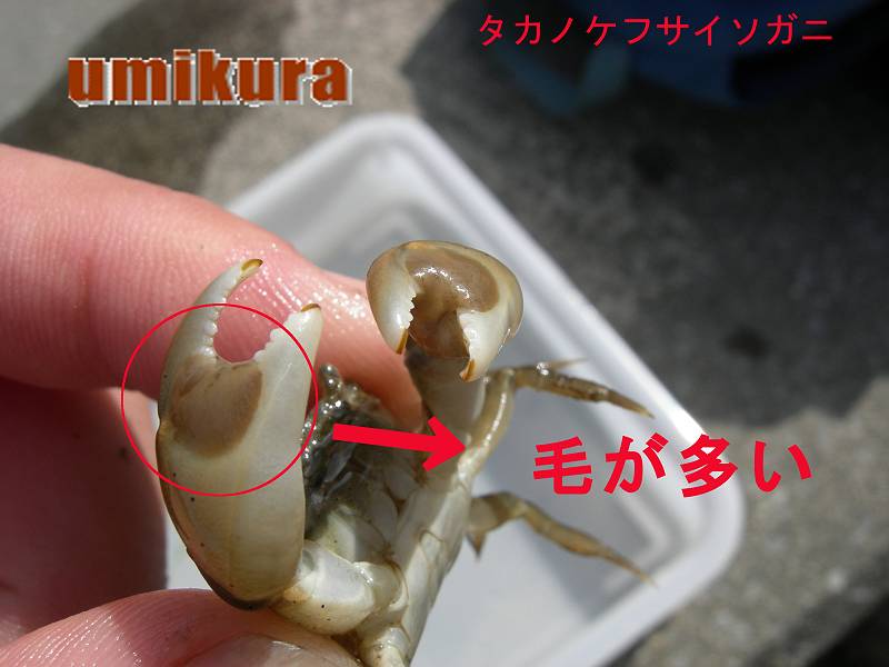 ケフサイソガニには大変良く似た仲間のタカノケフサイソガニがいます。オスのハサミの所に泥が着いたように毛房がありますがこの大きさが小さい方がケフサイソガニです。またお腹の方を見て斑点があるのがケフサイソガニです。この種も甲羅模様のバリエーションが豊富です。クロダイ釣りの餌になるそうです。