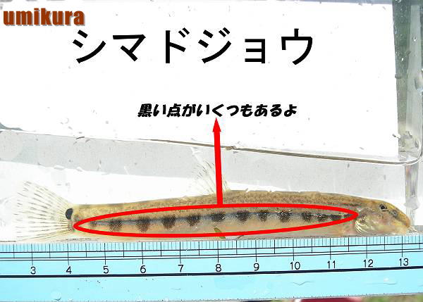 シマドジョウは川底が砂の所に住んでいます。海蔵川では御館橋周辺や末広橋上流の砂の溜まっている場所にいました。御館橋ではドジョウよりこちらの方が多かったです。口元には左右に3本づつ、合計6本のヒゲがあります。 ドジョウのところでも書きましたが、丸々太っていて河床が栄養豊富なのでしょう。 この魚たちが再び田んぼを行き来するよになる事を祈るばかりです。