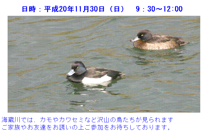 | 日時 : 平成20年11月30日(日) 9:30から12:00 雨天中止 集合場所 : 海蔵川 代官橋(四日市市西坂部町) 駐車場有り 9時30分までにお越し下さい 代官橋上流で観察します 参加 : どなたでも参加できます(参加費無料) 小学3年生以下のお子さんは、保護者同伴 先着30名さま、まで受け付けます。 申込み : 11月25日までに下記へ お問合せ : お電話または、eメールで氏名・電話番号・住所 を連絡下さい。 尾畑玲子 TEL:059-333-1287 安藤宣朗 TEL:059-331-8683 eメール : ando-nyhsh@nifty.com 参加申込フォーム 持ち物 : 双眼鏡、図鑑をお持ちの方はご持参下さい。 雨具、防寒具、メモなど。 なお、双眼鏡やスコープを数台準備しておりますので ご利用下さい。 |